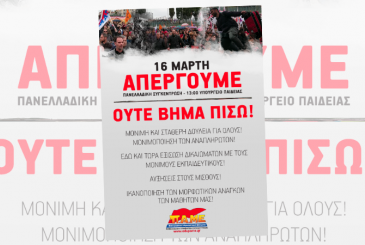 Χαιρετίζουμε τη νέα μαζική συμμετοχή μονίμων και αναπληρωτών συναδέλφων στις απεργιακές συγκεντρώσεις στις 16 Μάρτη στην Αθήνα, στο Υπουργείο Παιδείας, στη Θεσσαλονίκη και σε άλλες περιοχές όλης της Ελλάδας.