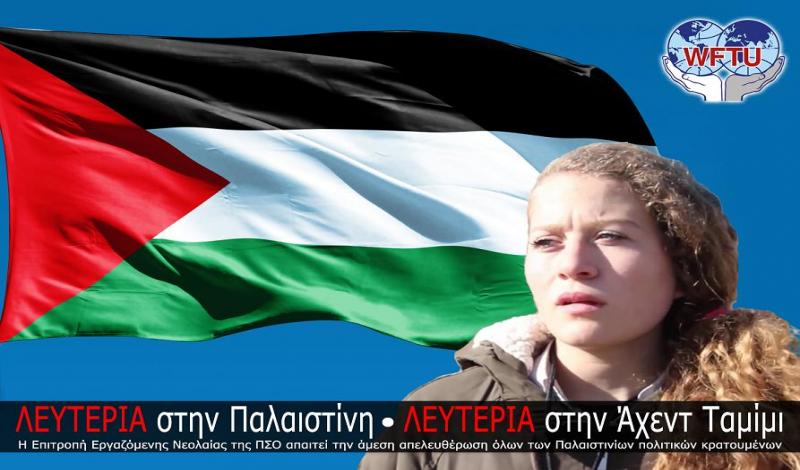 Η σύλληψη και η απαγγελία 12 κατηγοριών κατά της 16χρονης Παλαιστίνιας Άχεντ Ταμίμι, από ισραηλινό στρατοδικείο είναι ξεγύμνωμα όλων όσων μαζί με τις ΗΠΑ και το Ισραήλ μιλούν για «Δημοκρατία και Ελευθερία», που επιβάλλουν το «δίκιο» τους με στρατοδικεία, φυλακίσεις και δολοφονίες νέων παιδιών. Είναι ξεγύμνωμα της Κυβέρνησης ΣΥΡΙΖΑ-ΑΝΕΛ, που μιλά για Ειρήνη και σταθερότητα στην περιοχή και οικοδομεί σχέσεις με κράτη όπως το Ισραήλ που φυλακίζει και δολοφονεί μικρά παιδιά, ενώ ταυτόχρονα η Κυβέρνηση συνεχίζει να μην αναγνωρίζει το Παλαιστινιακό κράτος παρά την απόφαση του ελληνικού κοινοβουλίου το Δεκέμβρη του 2015.