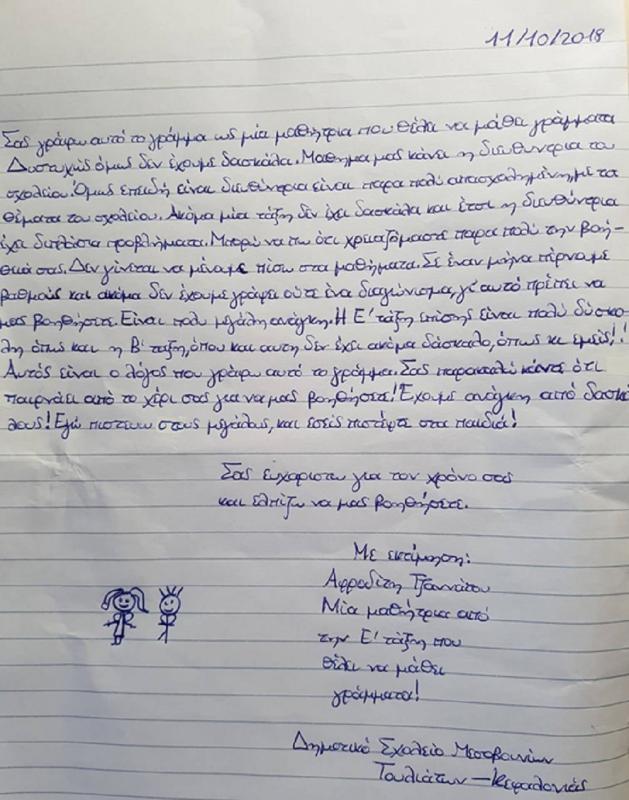 Η κραυγή αγωνίας που αποτυπώνει στο γράμμα μαθήτρια του Δημοτικού των Μεσοβουνείων