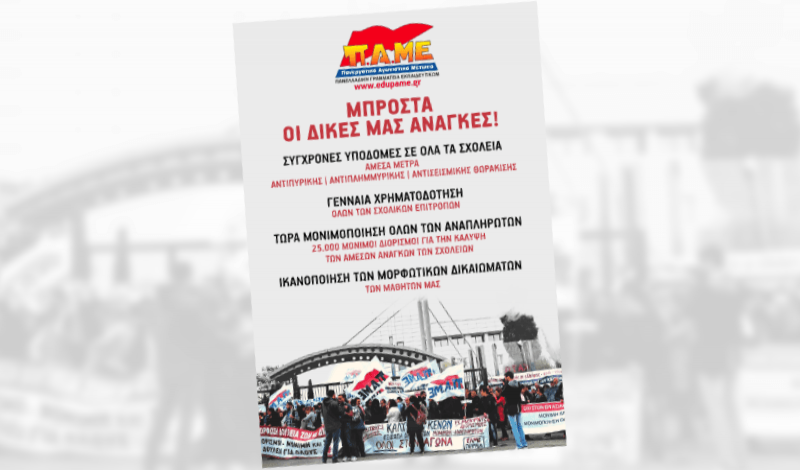 Την ίδια ώρα, η κυβέρνηση κλείνει τη συμφωνία με τα Σκόπια για να ενισχύσει τη δολοφονική μηχανή του ΝΑΤΟ. Υλοποιεί καθημερινά τους επικίνδυνους ιμπεριαλιστικούς σχεδιασμούς στα Βαλκάνια, που γεννούν πολέμους και προσφυγιά, μετατρέπει τη χώρα μας σε μια απέραντη Νατοϊκή βάση. Εισπράττει για τα παραπάνω τα συγχαρητήρια από τους εταίρους της, τους αξιωματούχους της Ε.Ε. και του ΔΝΤ, τους δολοφόνους του ΝΑΤΟ. Έχουμε χρέος, όχι μόνο ως παιδαγωγοί, να υποδεχθούμε τα χιλιάδες προσφυγόπουλα, που θα έρθουν και φέτος στα σχολεία μας. Δίνουμε τη μάχη ενάντια στις αιτίες που γεννούν τον ιμπεριαλιστικό πόλεμο και την προσφυγιά.