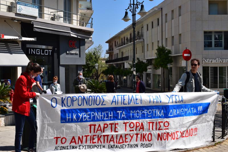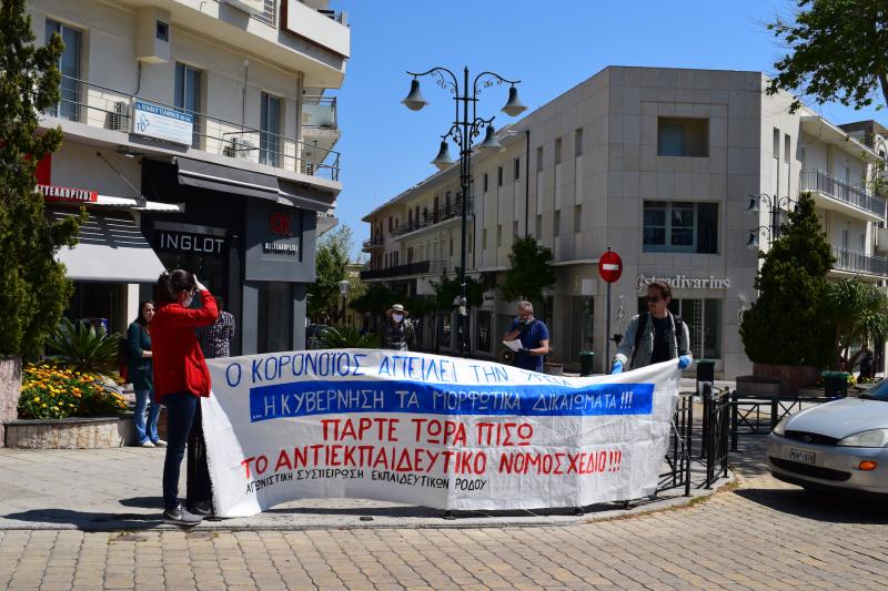 Χαιρετίζουμε τους εκπαιδευτικούς και τους φοιτητές οι οποίοι πραγματοποίησαν παράσταση διαμαρτυρίας στην πλατεία Κύπρου, σήμερα 28-4, τηρώντας όλα τα μέτρα προστασίας και  κρατώντας τις αποστάσεις ασφαλείας.  Με ηχηρό τρόπο απέδειξαν ότι το συνδικαλιστικό κίνημα είναι παρόν σε οποιεσδήποτε συνθήκες κόντρα στους άθλιους σχεδιασμούς Κυβέρνησης και Υπουργείου Παιδείας να καταθέσει το πολυνομοσχέδιο σαν τον κλέφτη εν μέσω πανδημίας και απαγορεύσεων.
