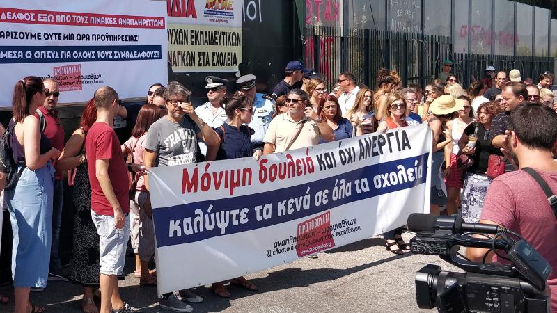 Παρόλο που βρισκόμαστε ακόμα στην καλοκαιρινή περίοδο, πλήθος αναπληρωτών και μόνιμων συναδέλφων συμμετείχαν στην κινητοποίηση με κύρια αιτήματα: κανένας συνάδελφος να μη μείνει έξω από τους πίνακες των αναπληρωτών και να ανοίξει άμεσα ο ΟΠΣΥΔ για όλους, να μονιμοποιηθούν εδώ και τώρα όλοι οι αναπληρωτές που δούλεψαν τα τελευταία χρόνια, να καταργηθεί ο νόμος 4589/19 και όλο το νομοθετικό πλαίσιο που οδηγεί σε απολύσεις κα ανακύκλωση της ανεργίας.