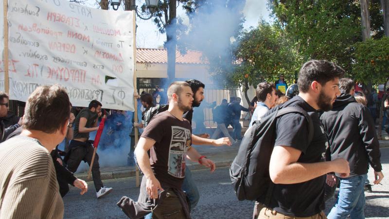 Οι εκπαιδευτικοί και οι φοιτητές που συμμετείχαν στο συλλαλητήριο πορεύτηκαν από τα Προπύλαια προς τη Βουλή και το Μέγαρο Μαξίμου, για να ζητήσουν, όπως είχαν εξαγγείλει, απαντήσεις από την κυβέρνηση, η οποία παρέταξε τις κλούβες και τα ΜΑΤ μπροστά από το Μέγαρο Μαξίμου και «έπνιξε» στα χημικά τη συγκέντρωση.
