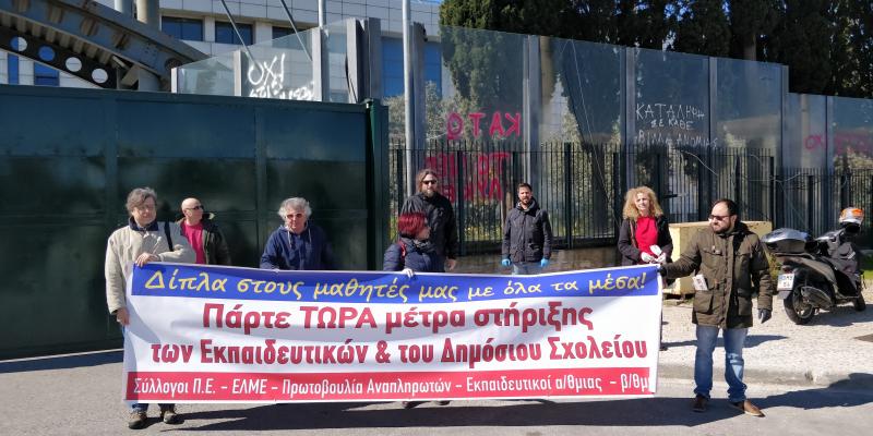Ολιγομελής αντιπροσωπεία Συλλόγων Εκπαιδευτικών Π.Ε. και ΕΛΜΕ πραγματοποίησε, σήμερα, Πέμπτη 2 Απριλίου στο Υπουργείο Παιδείας, την προγραμματισμένη παράσταση διαμαρτυρίας για τα προβλήματα με τα οποία έρχονται αντιμέτωποι εκπαιδευτικοί και μαθητές στην εξ αποστάσεως εκπαίδευση, παρά τα ευχολόγια της κυβέρνησης. Επιπλέον κατατέθηκε στη Γενική Γραμματέα του Υπουργείου η σχετική επιστολή διαμαρτυρίας των εκπαιδευτικών. Στην εν λόγω πρωτοβουλία ανταποκρίθηκαν και υπέγραψαν, μέχρι τώρα, πάνω 5.500 εκπαιδευτικοί.