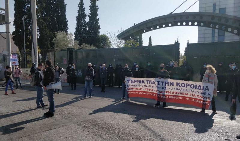 Με μαχητικότητα και τηρώντας μέχρι κεραίας όλα τα απαραίτητα μέτρα προστασίας, σωματεία εκπαιδευτικών και η «Πρωτοβουλία Αναπληρωτών», πραγματοποίησαν σήμερα παράσταση διαμαρτυρίας στο υπουργείο Παιδείας, ζητώντας μέτρα για την ισότιμη πρόσβαση των μαθητών στην Εκπαίδευση, ικανοποίηση των αιτημάτων που όλο αυτό το διάστημα διεκδικούν για ασφάλεια, υγεία στα σχολεία και για τα μορφωτικά δικαιώματα των παιδιών, ώστε να ανοίξουν τα σχολεία με ασφάλεια.