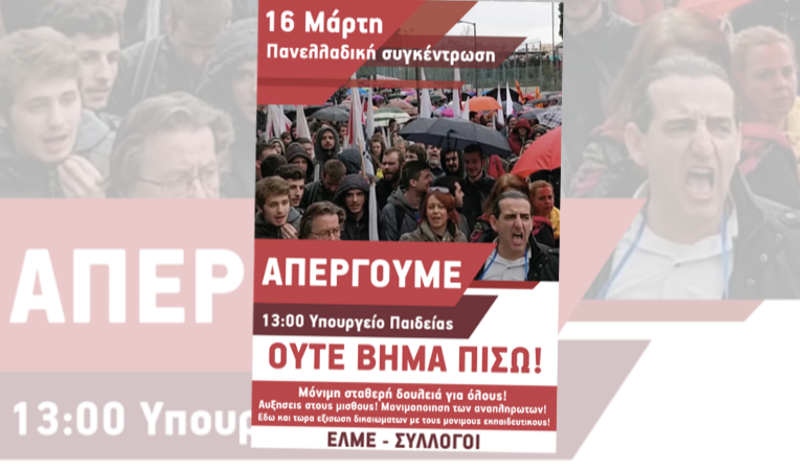 16 Μάρτη ΑΠΕΡΓΟΥΜΕ και Συμμετέχουμε στο ΠΑΝΕΛΛΑΔΙΚΟ ΣΥΛΛΑΛΗΤΉΡΙΟ ΣΤΟ ΥΠ. ΠΑΙΔΕΙΑΣ!