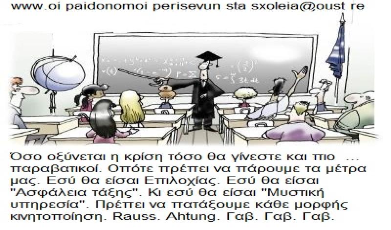 Την ώρα που οι μαθητές και οι γονείς τους υφίστανται, με τον πιο άγριο τρόπο, τη βία της εφαρμοζόμενης πολιτικής, με την αφαίρεση δικαιωμάτων στη δουλειά και στη μόρφωση, με τα σχέδια για σχολείο της «αγοράς» όπου θα κάνουν κουμάντο οι επιχειρήσεις, το υπουργείο ...θυμήθηκε να στείλει εγκύκλιο για την «αποτύπωση καλών πρακτικών σχολικών μονάδων Δευτεροβάθμιας Εκπαίδευσης για την πρόληψη και αντιμετώπιση της βίας και επιθετικότητας μεταξύ μαθητών».